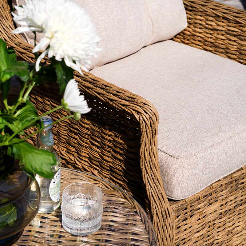 Serien kommer i farven rustik på polyrattan med beigefarvede hynder.