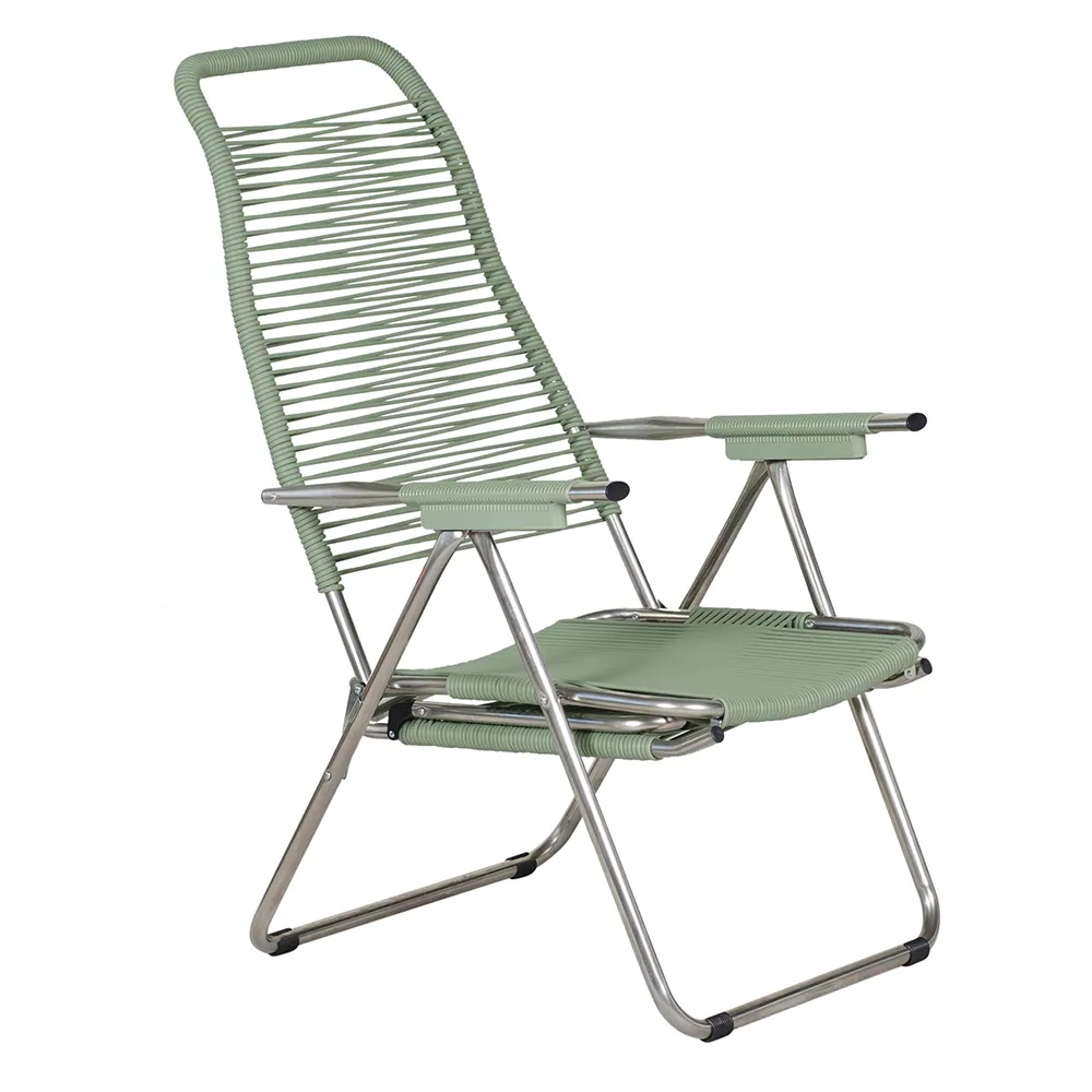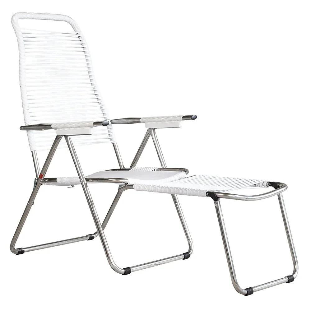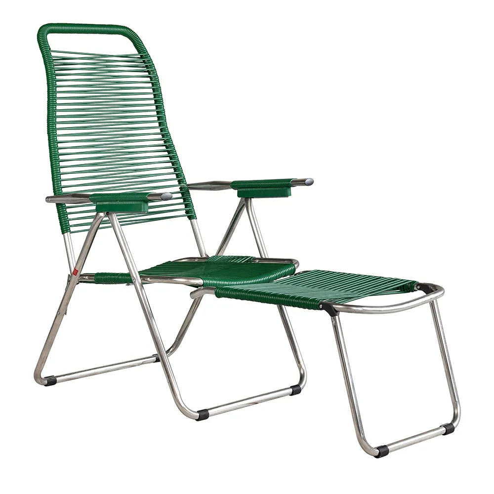 Afslapningsstolen Spaghetti fra Fiam kan justeres i fem forskellige positioner. Den er udstyret med en indfældbar fodskammel for maksimal komfort.